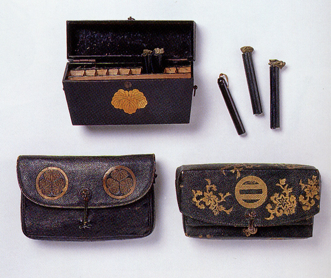 ①黒漆塗胴乱(紋付)②黒漆塗葵紋付胴乱 ③黒漆塗丸に二引紋付胴乱