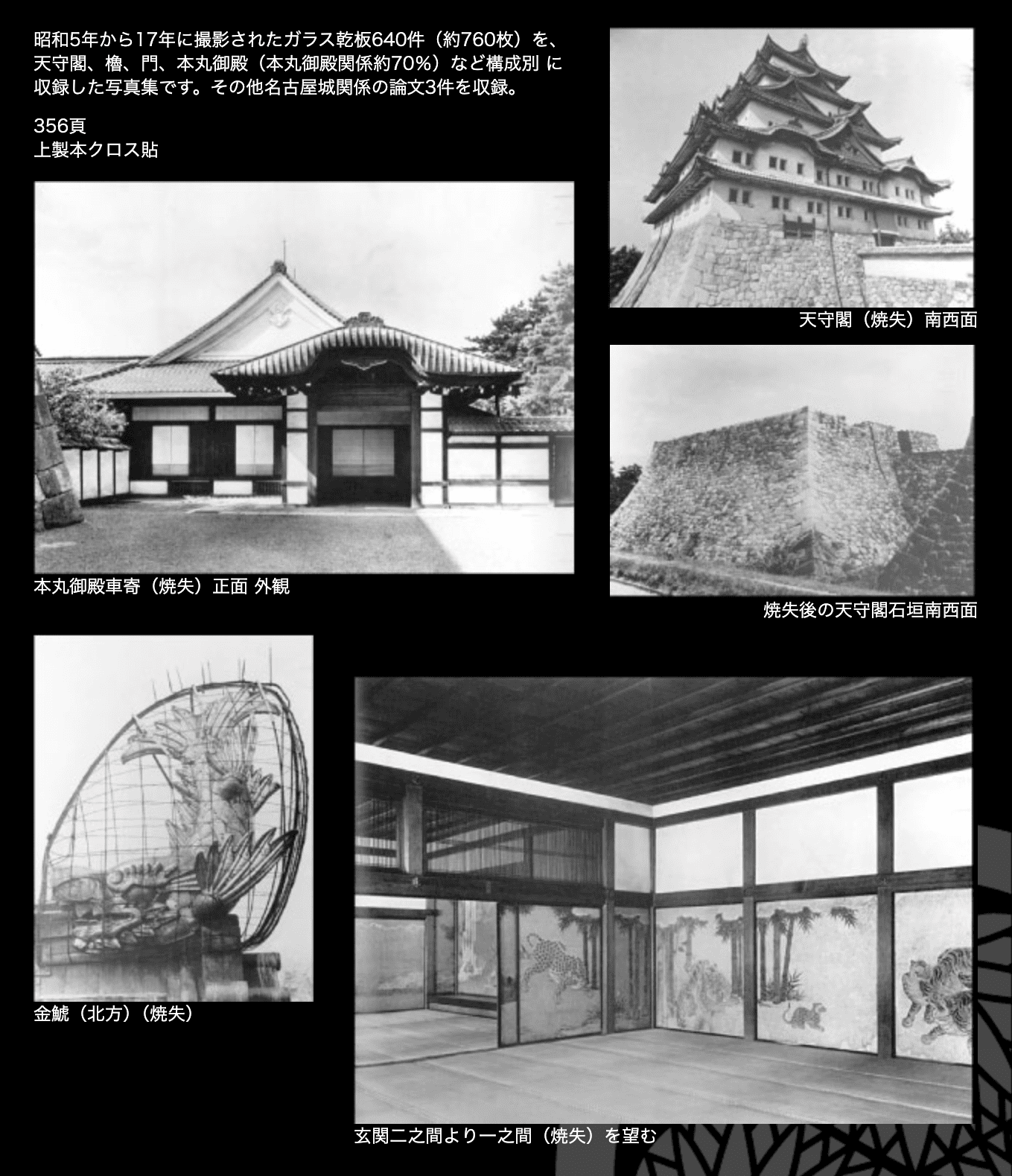 昭和5年から17年に撮影されたガラス乾板640件(約760枚)を、天守閣、櫓、門、本丸御殿(本丸御殿関係約70%)など構成別に収録した写真集です。